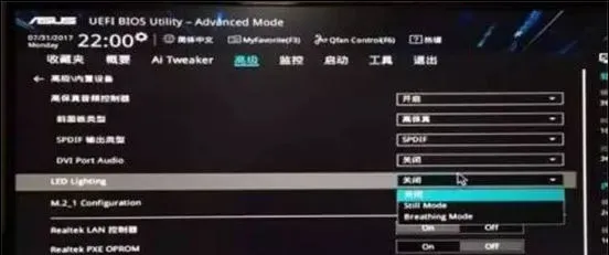 2. 接着按F7进入高级模式,然后点“高级”设置,再点击“内置设备”,接着选择“LED Lighting”。在下拉框中选择“关闭”。主板上的呼吸灯就会不亮了;